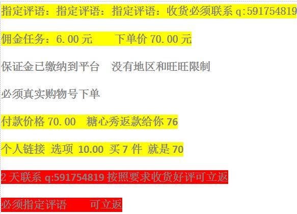 指定评语:指定评语:指定评语:收货必须联系q:591754819 佣金任务:6.00元 下单价70.00元 保证金已缴纳到平台 没有地区和旺旺限制 必须真实购物号下单 付款价格70.00 糖心秀返款给你76 单价10.00 买7件 就是70 2天联系q:591754819按照要求收货好评可立返 必须指定评语 可立返 |