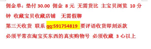 拍下需知:佣金单:垫付30.00 佣金 8元 无需货比 主宝贝浏览 10分钟 收藏宝贝收藏店铺 无需假聊 第三天收货 联系qq:591754819 要评语收货即刻返款 必须平常在淘宝买东西的真实购物号 必须收藏 3心以上